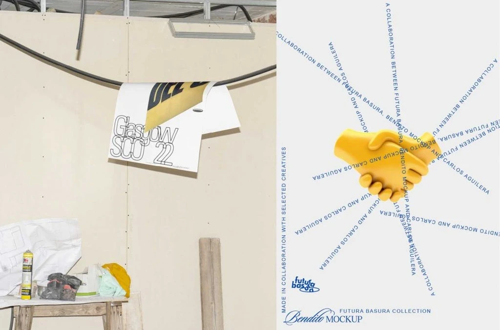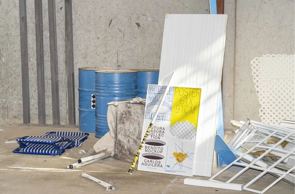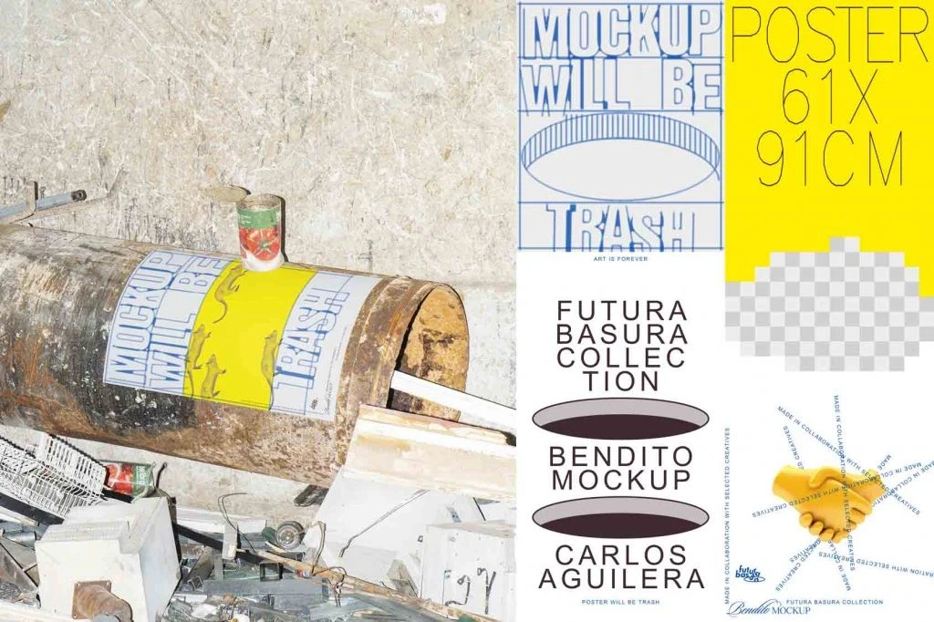 Posters have always been a great format for experimentation and we believe that mockups have the potential to evolve in this way as well. In this collection, we disrupted the traditional balance between the container and content. There are even occasions in which the latter is integrated into the environment in an extreme way and is even difficult to recognise. This sensation is even more heightened if we place it in chaotic scenarios of rubbish and waste. In the classic mockup scheme, the content’s leading role is clearly affected.