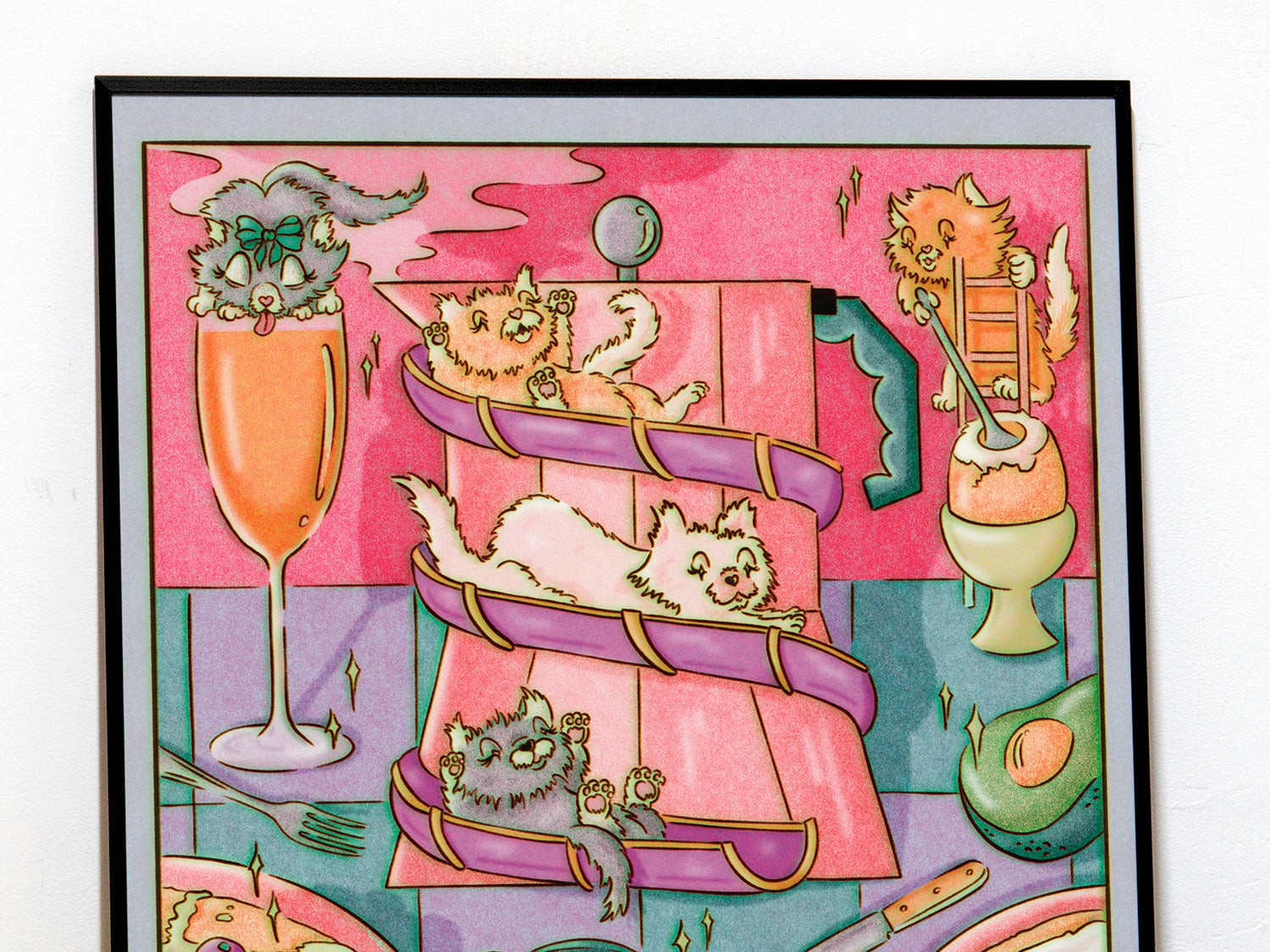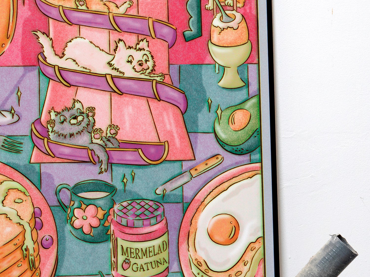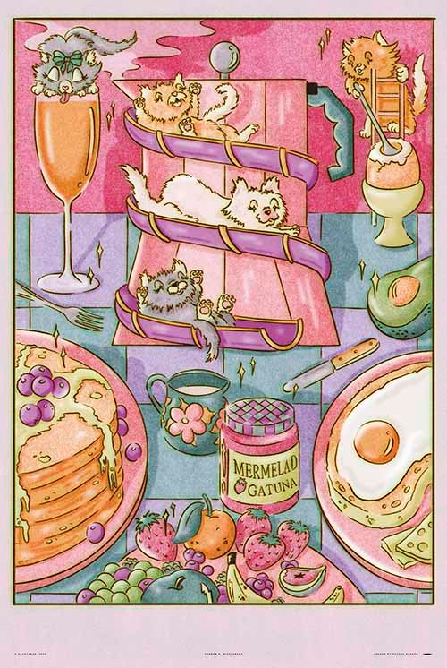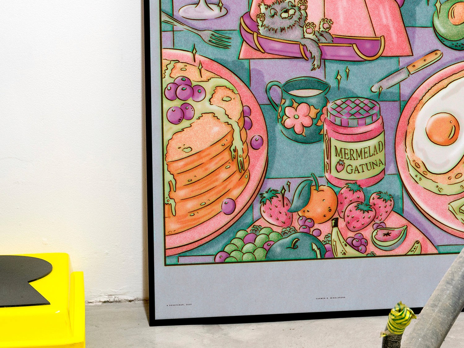 "A Desayunar" is a piece that highlights two things its author loves: breakfast and cats. The work celebrates the joy of eating and that almost childlike excitement that can come with the first bite of the day, reclaiming this everyday moment as a space for pleasure, motivation, and reflection. Beyond the early wake-up call, breakfast is conceived here as a daily ritual — an invitation to start the day with purpose. Print in Premium Matte 180 gr. Frame not included.