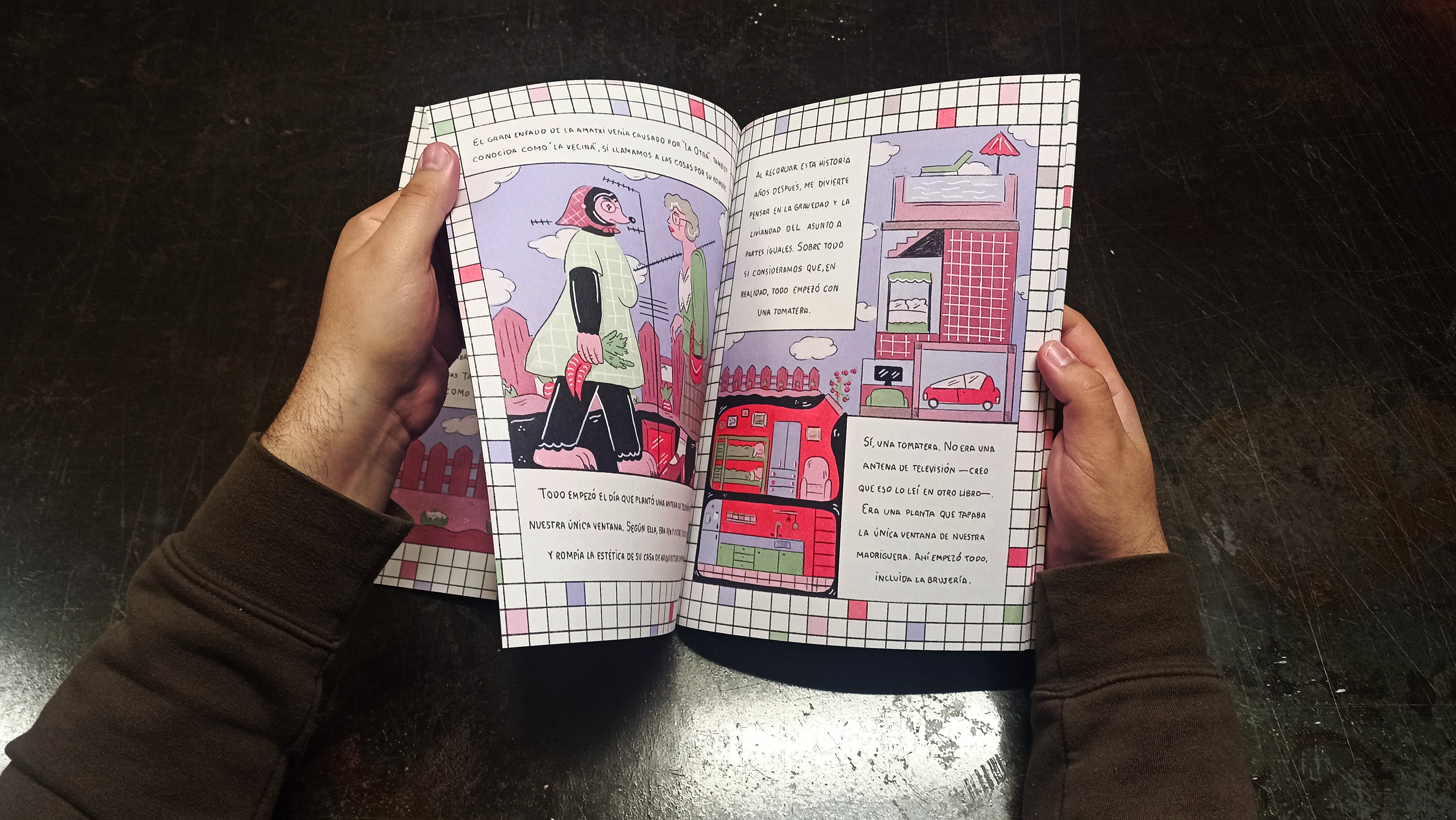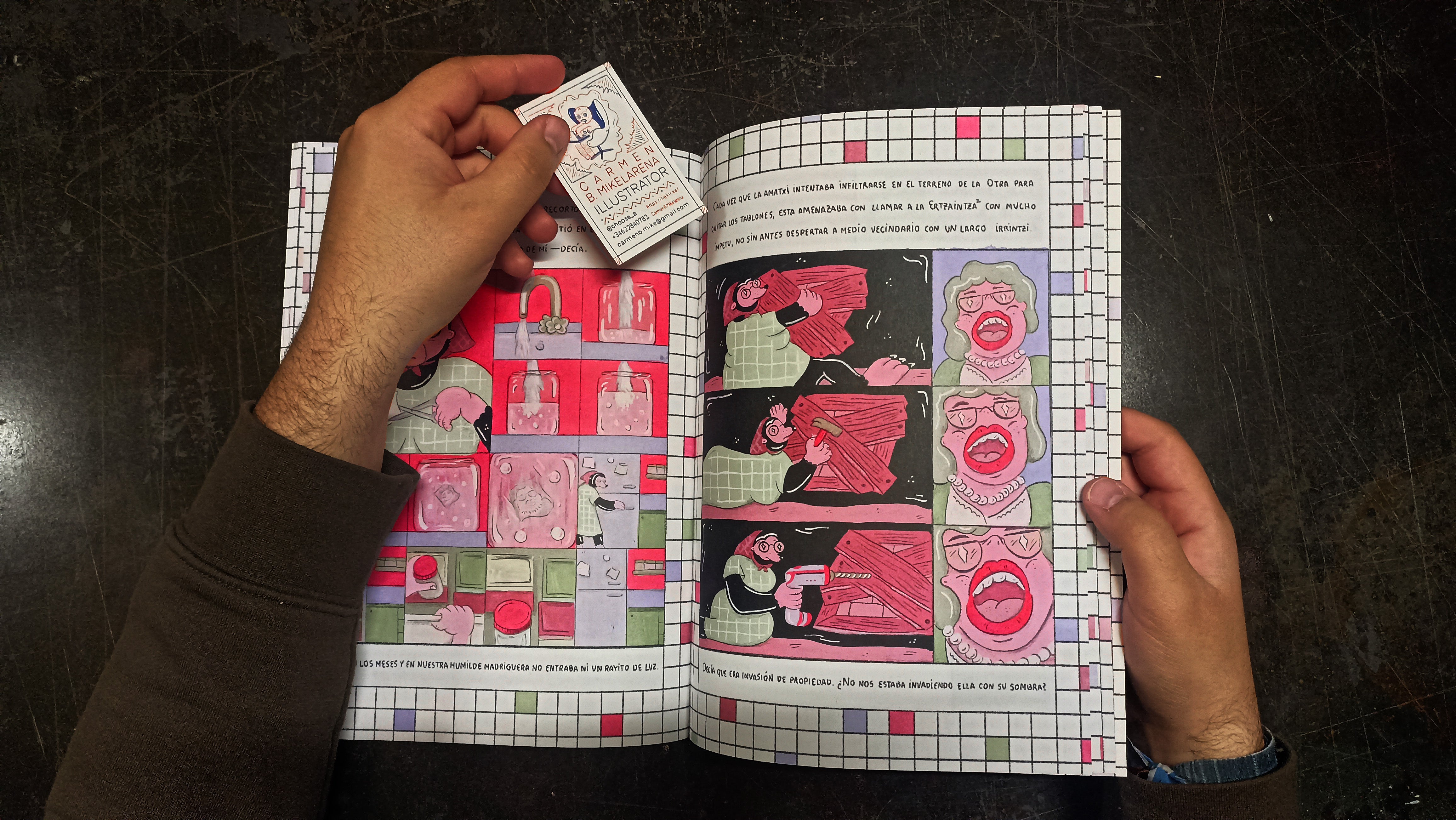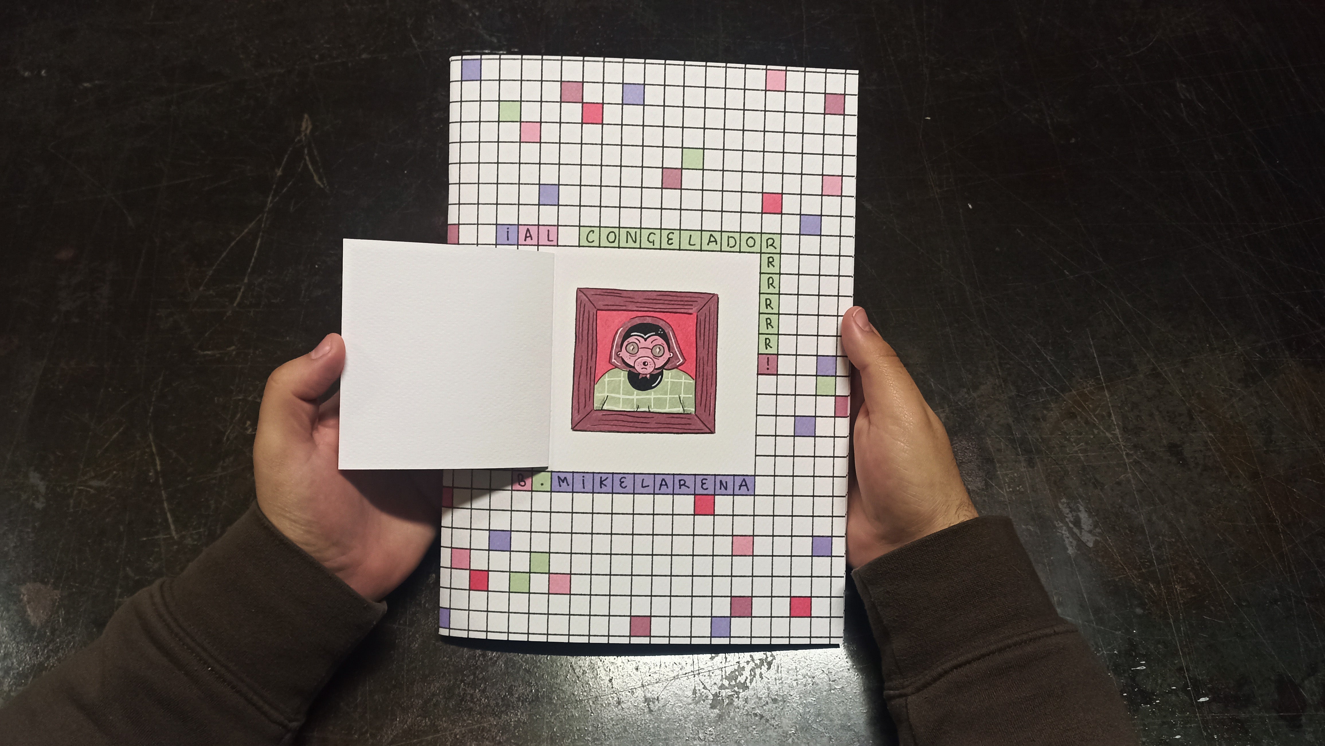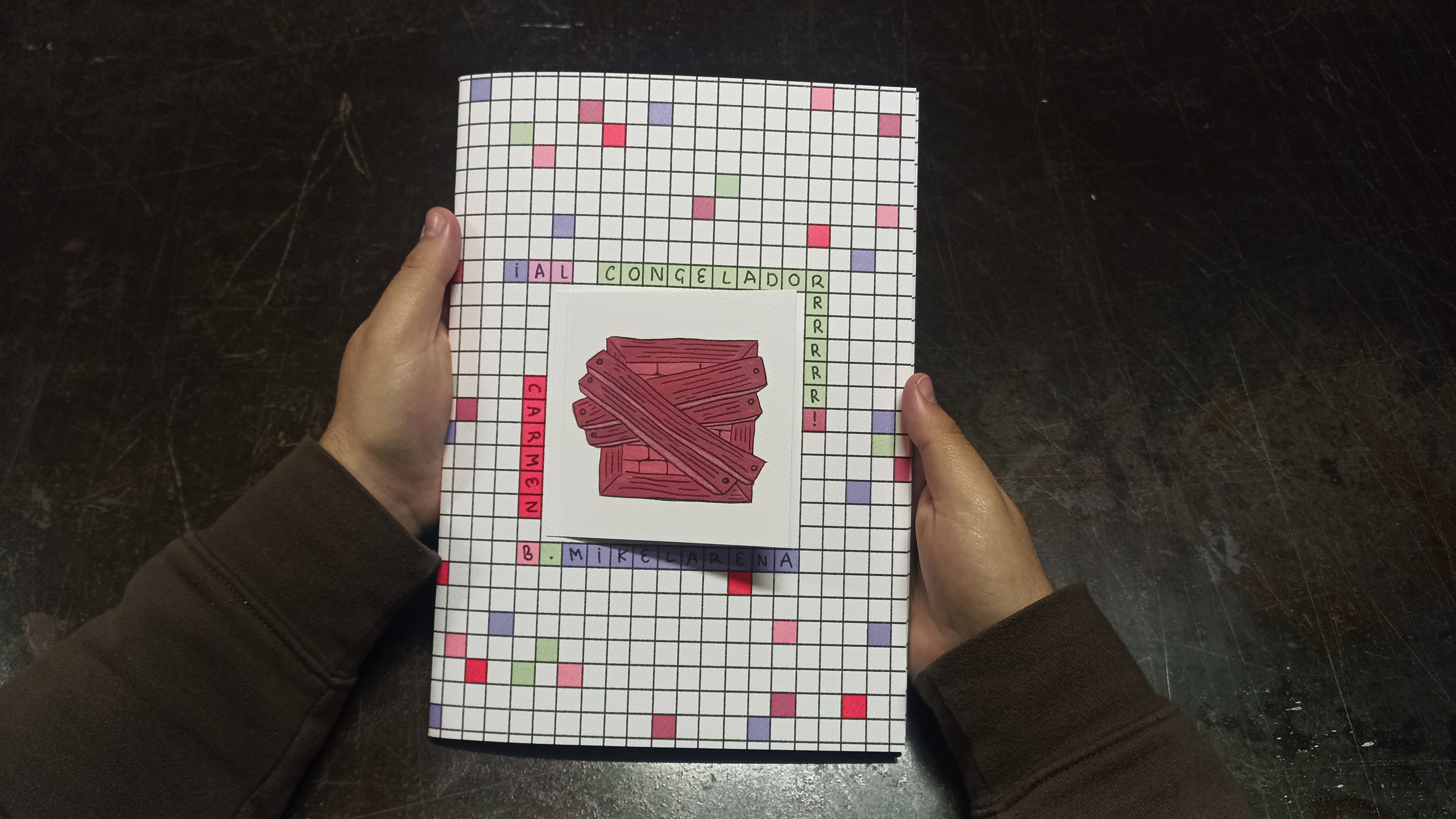 ¡Al congeladorrrrrr! is a fanzine about neighbors arguing and white magic. A4-sized pages printed on 120g recycled paper with a Turner - Tintoretto Gesso 300g cover. Awarded Best Fanzine at FanziMad 2025.