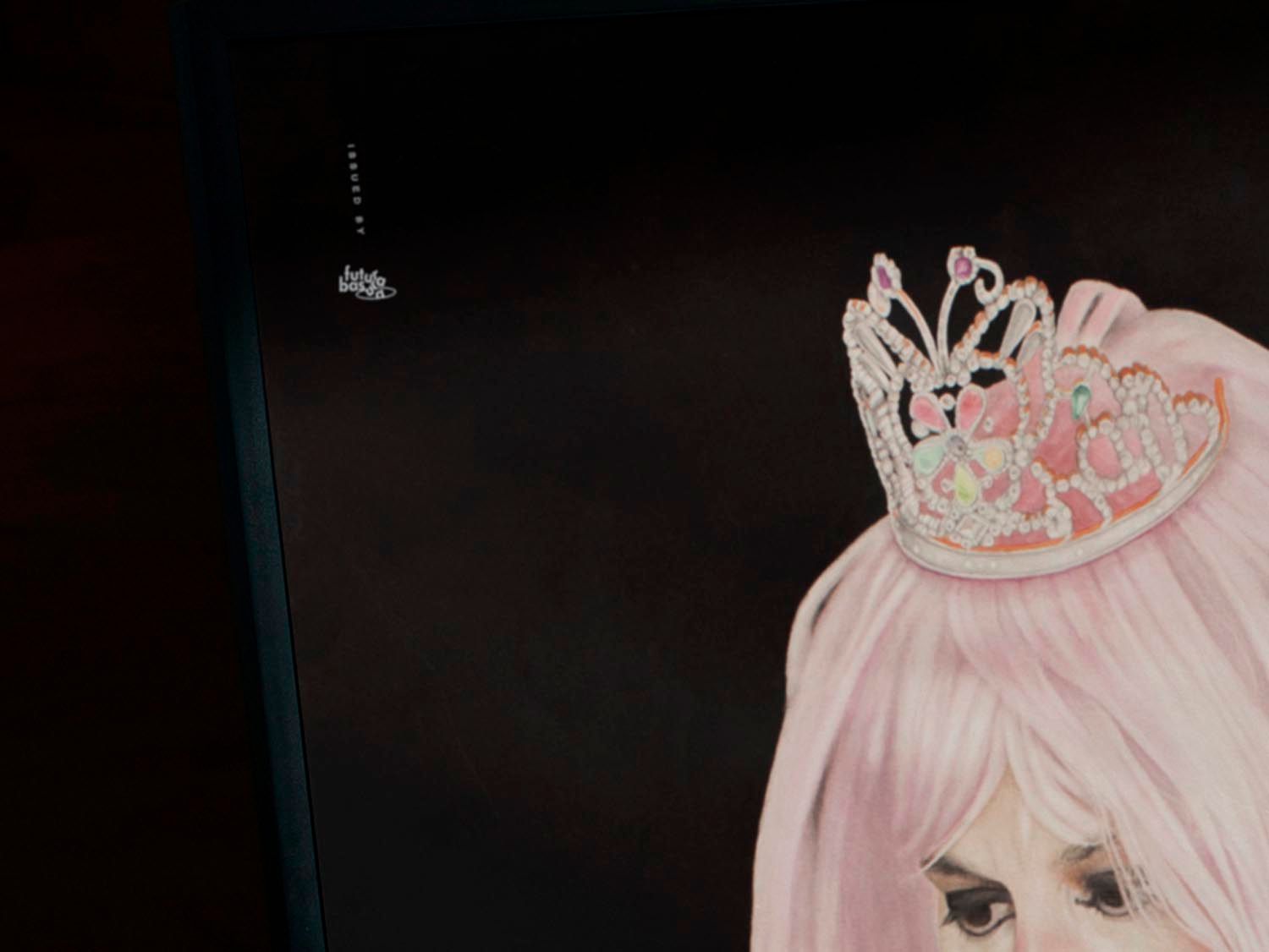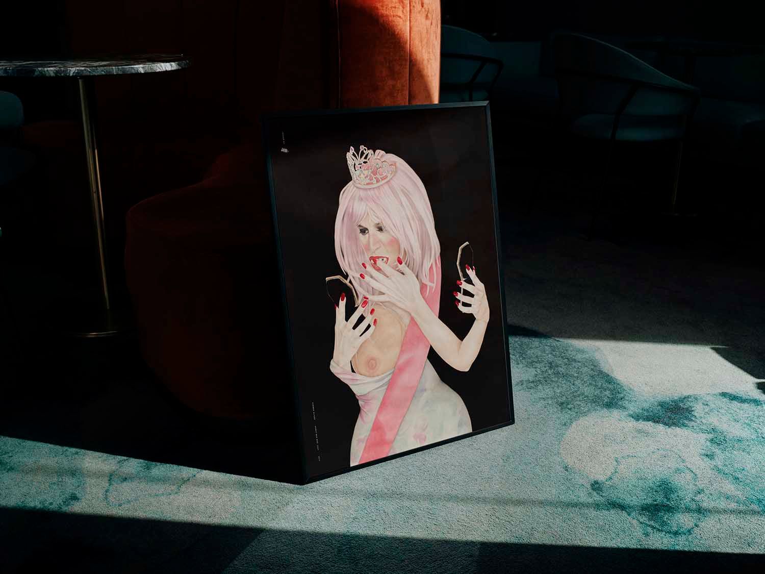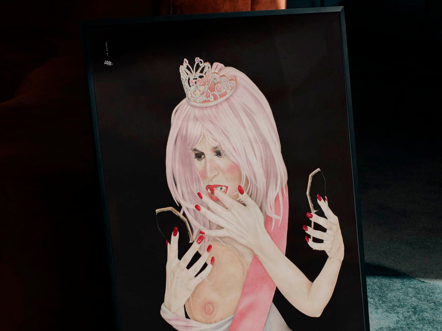 "Honey Boo Boo, 2047" is a piece that challenges the conventions of beauty and explores the madness surrounding desire. Inspired by the stage name of a famous child beauty pageant contestant, this work invites reflection on the beauty standards that envelop us and the relentless pursuit of an ideal body. Carmen's technique is a visual journey in itself. By using multiple layers of watercolor washes on delicate raw watercolor paper, she creates a depth and texture that captures attention. The finish in black paste watercolor adds a striking contrast, enhancing the complexity of the work and its underlying message. Printed on Premium Matte 180 g and available in a single format of 50 x 70 cm. Please note that it is sold without the frame.