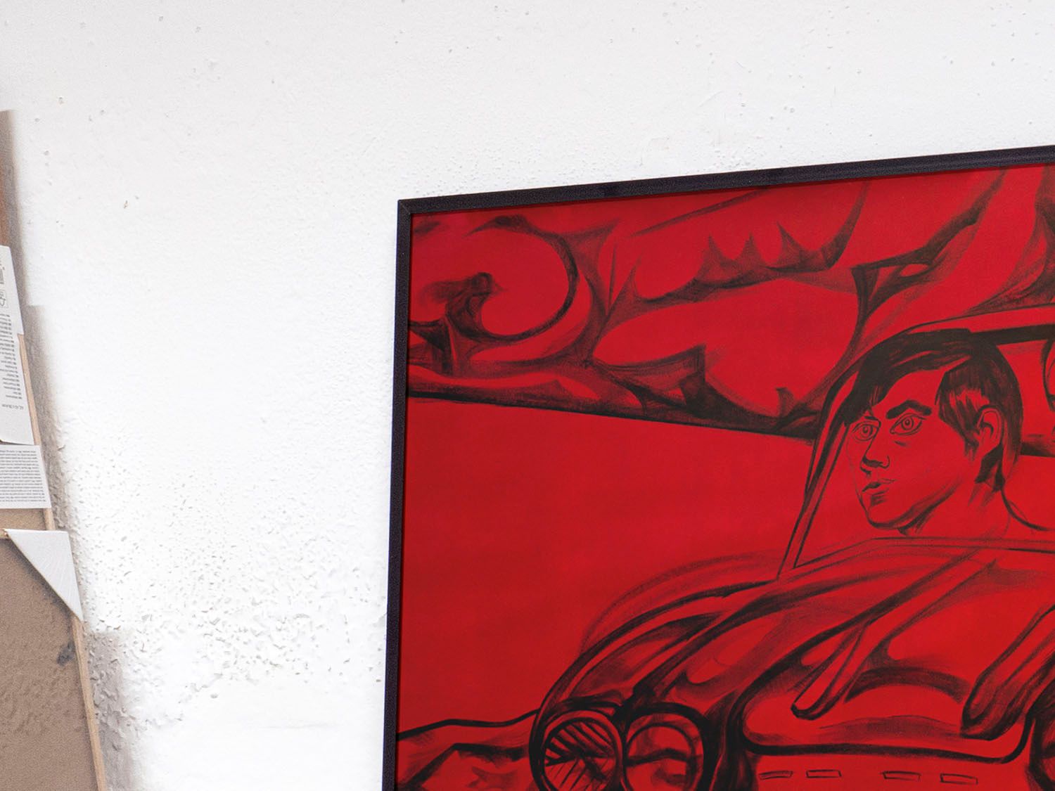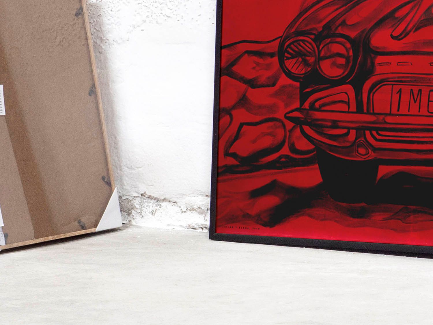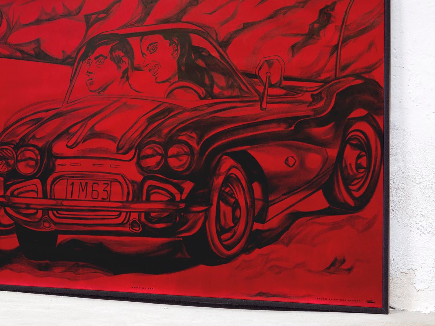 Drawings on a red background are very characteristic of Marta Beltrán’s work, and at Futura Basura we always knew we wanted to publish one of them. Julián y Elena also carries the cinematic quality so present in her practice. This large-format drawing presents a film-like scene rich in detail.