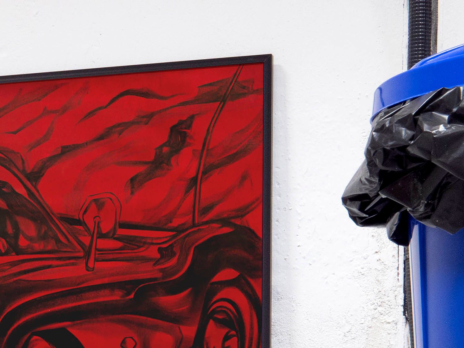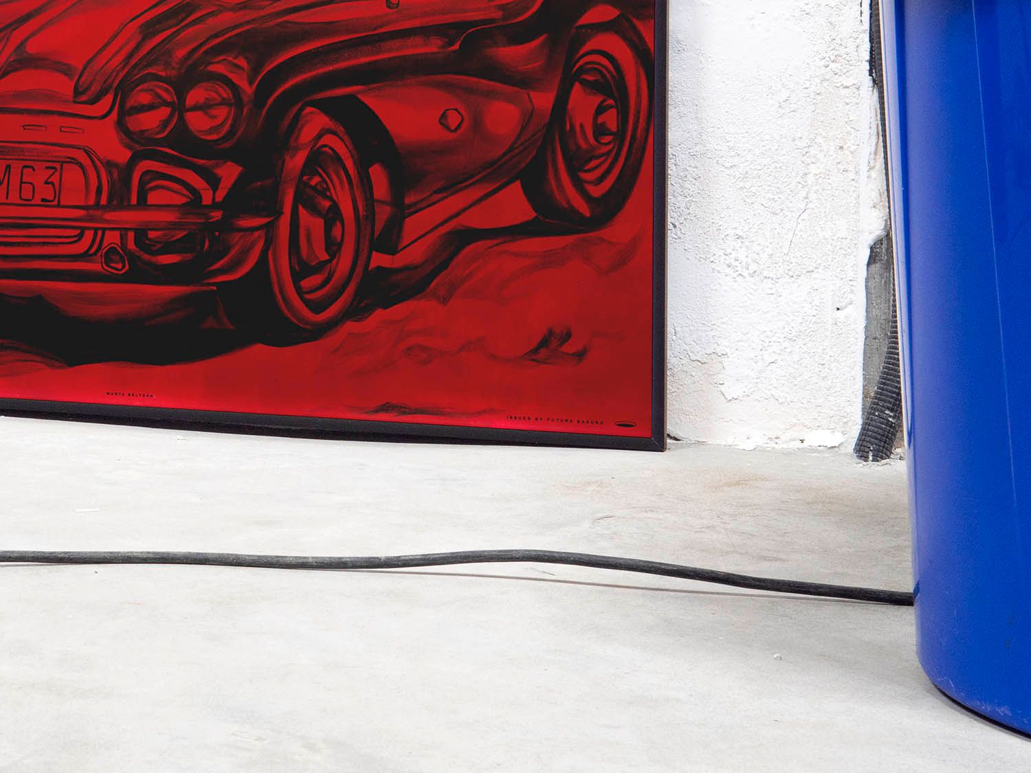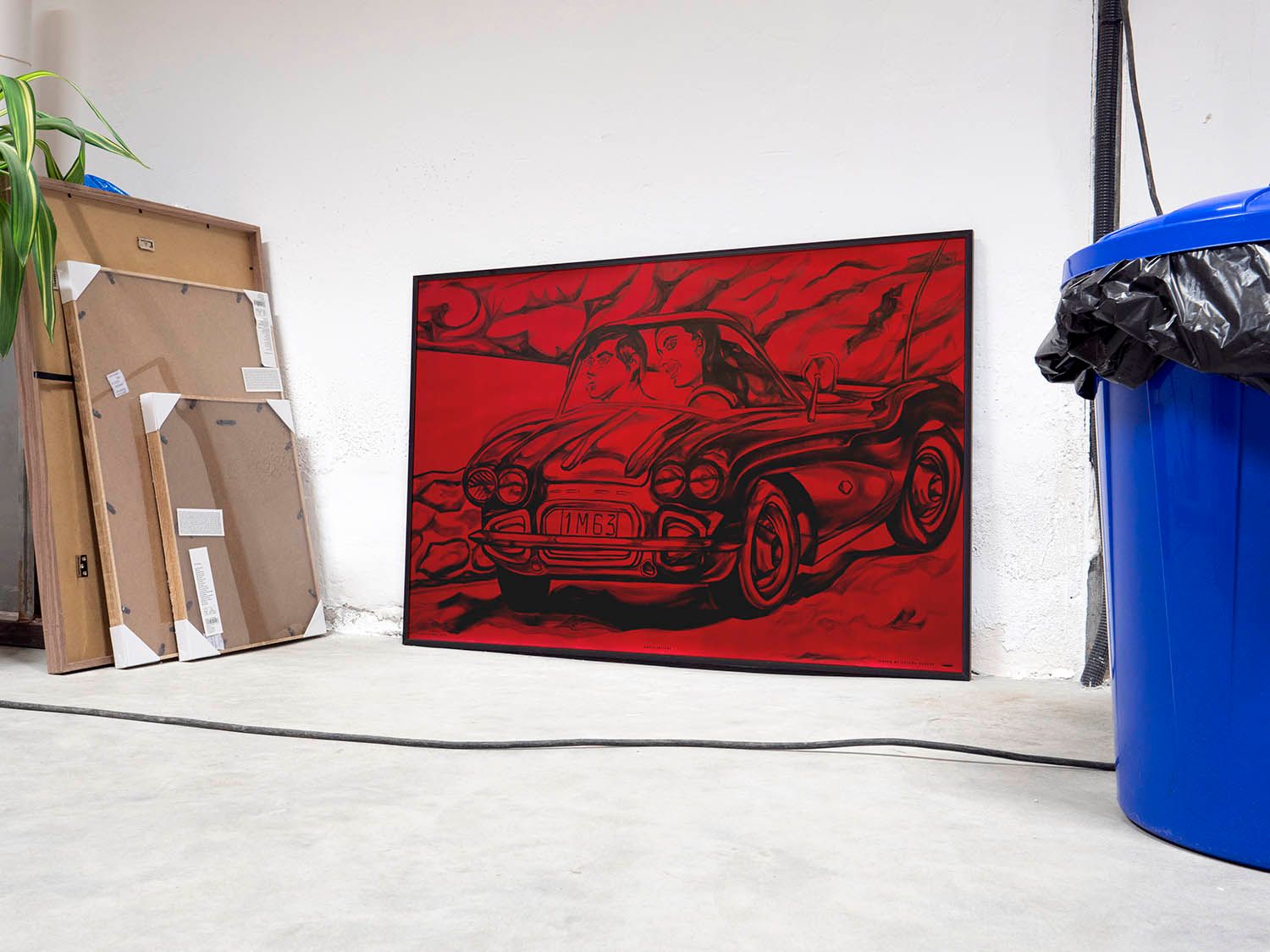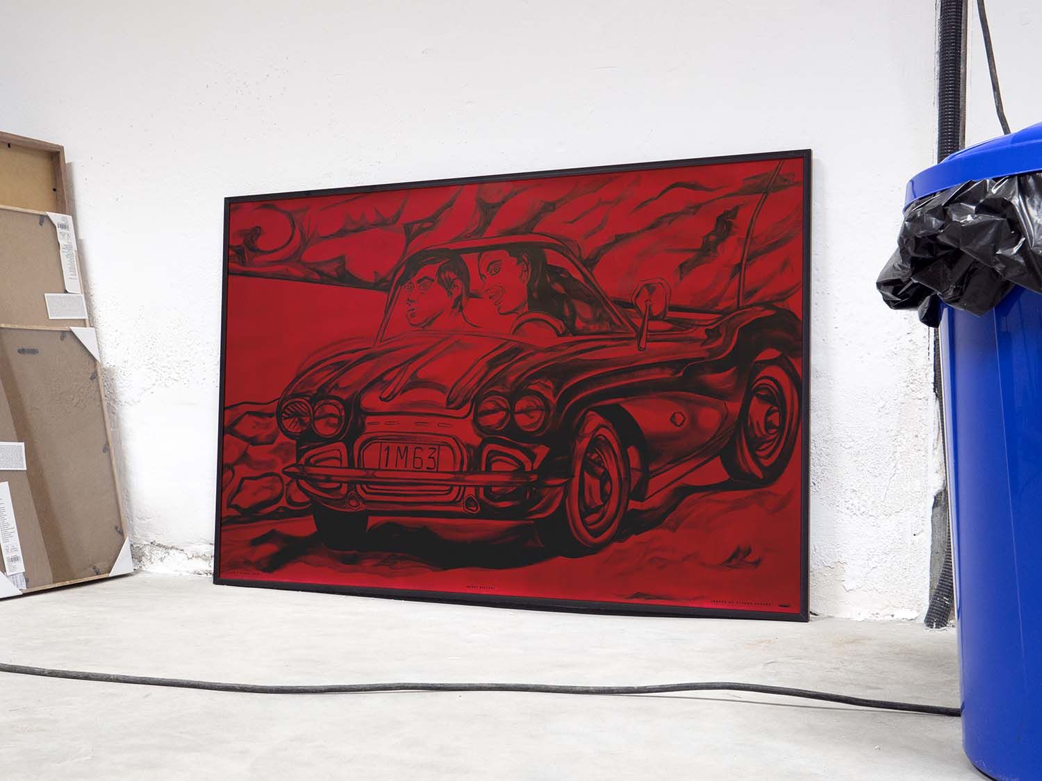 Drawings on a red background are very characteristic of Marta Beltrán’s work, and at Futura Basura we always knew we wanted to publish one of them. Julián y Elena also carries the cinematic quality so present in her practice. This large-format drawing presents a film-like scene rich in detail.