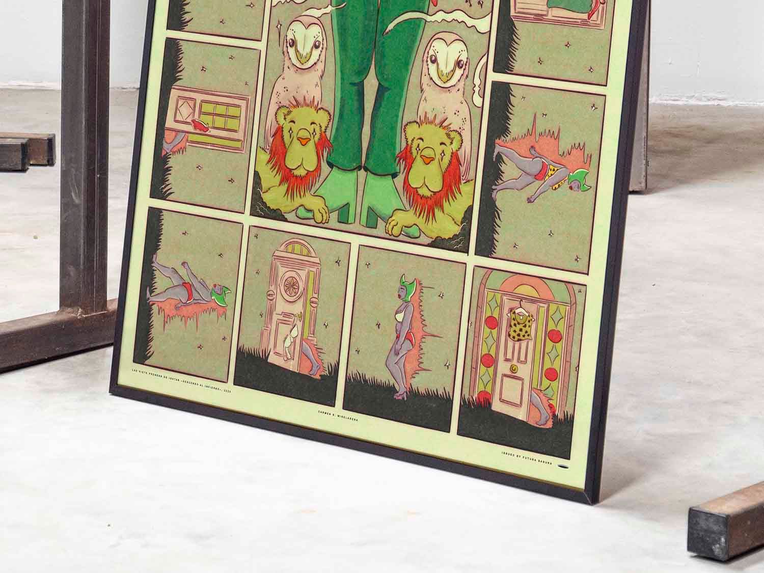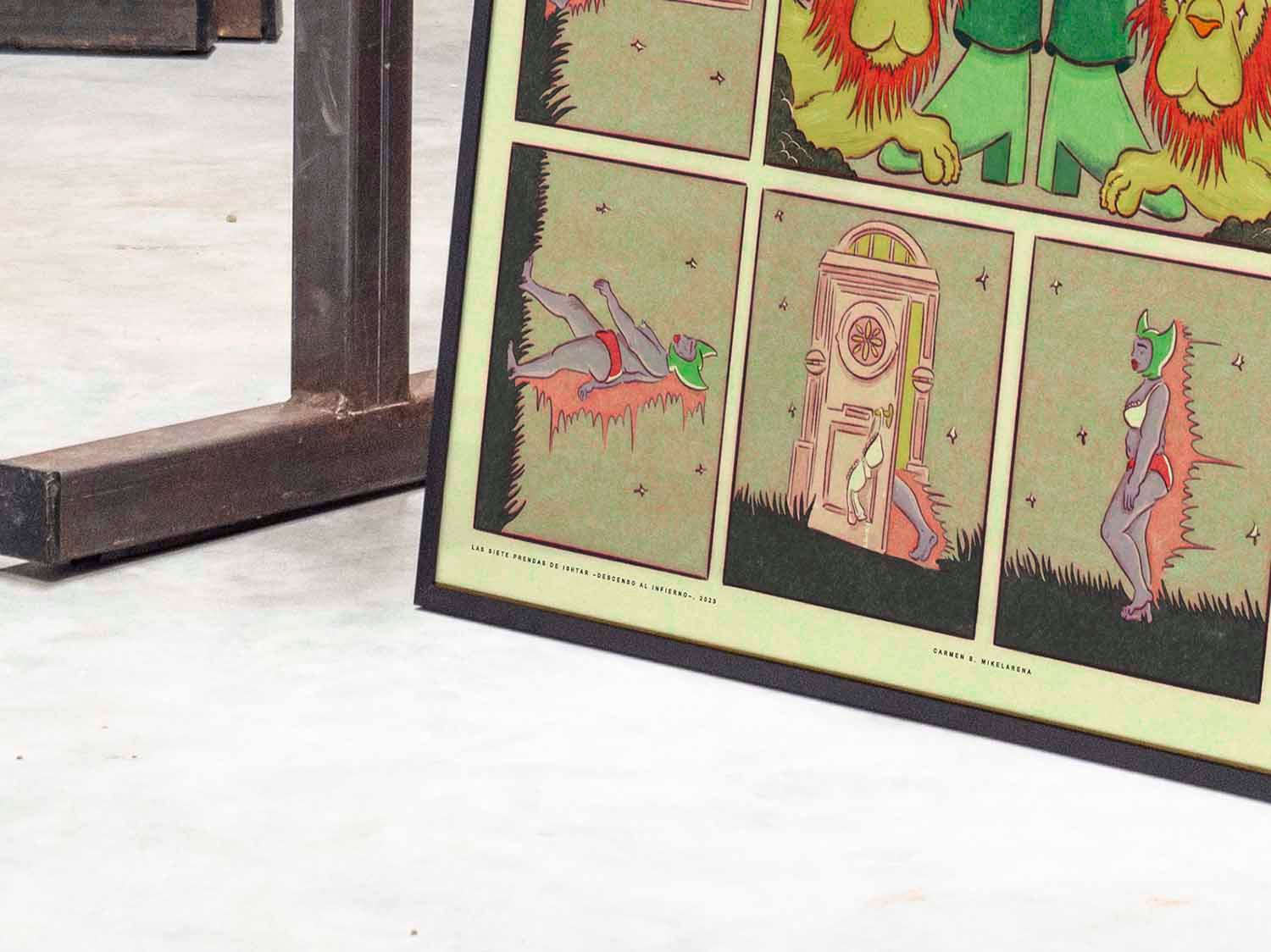 First comic joining Futura Basura catalog. Carmen B. Mikelarena reimagines Ishtar's descent into the underworld, where, according to the original myth, she seeks to strengthen her power. Challenged by her sister Ereshkigal, Ishtar must shed a garment for each of the seven gates she crosses. The narrative of this comic focuses especially on reinterpreting this specific aspect of the myth. Print in Premium Matte 180 gr. Frame not included.