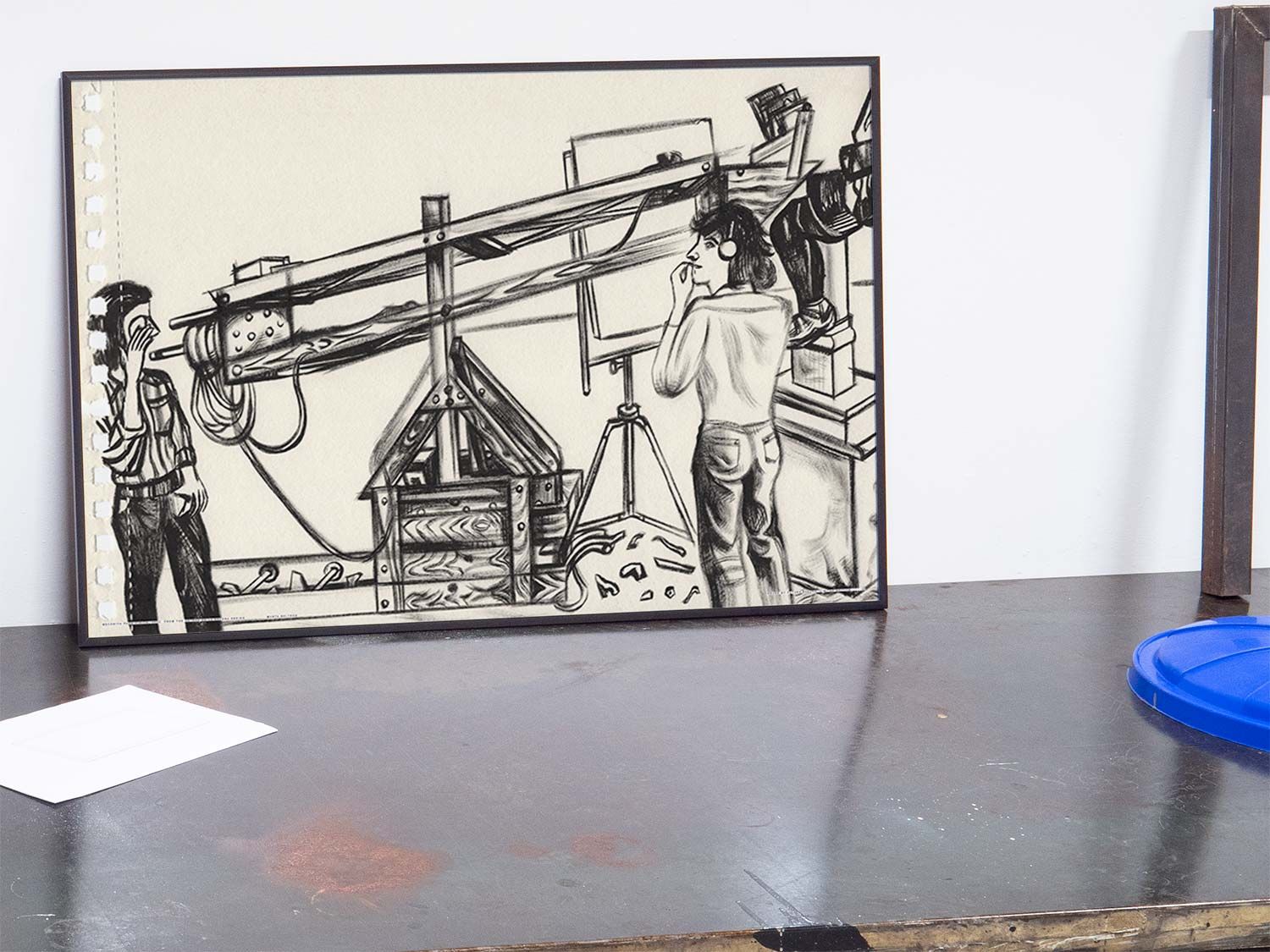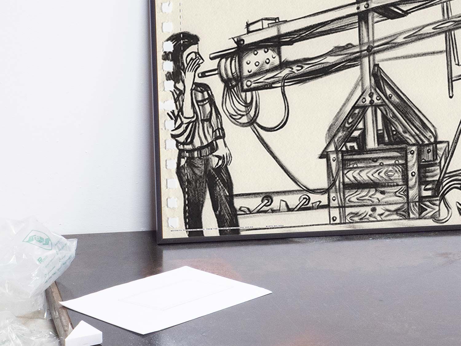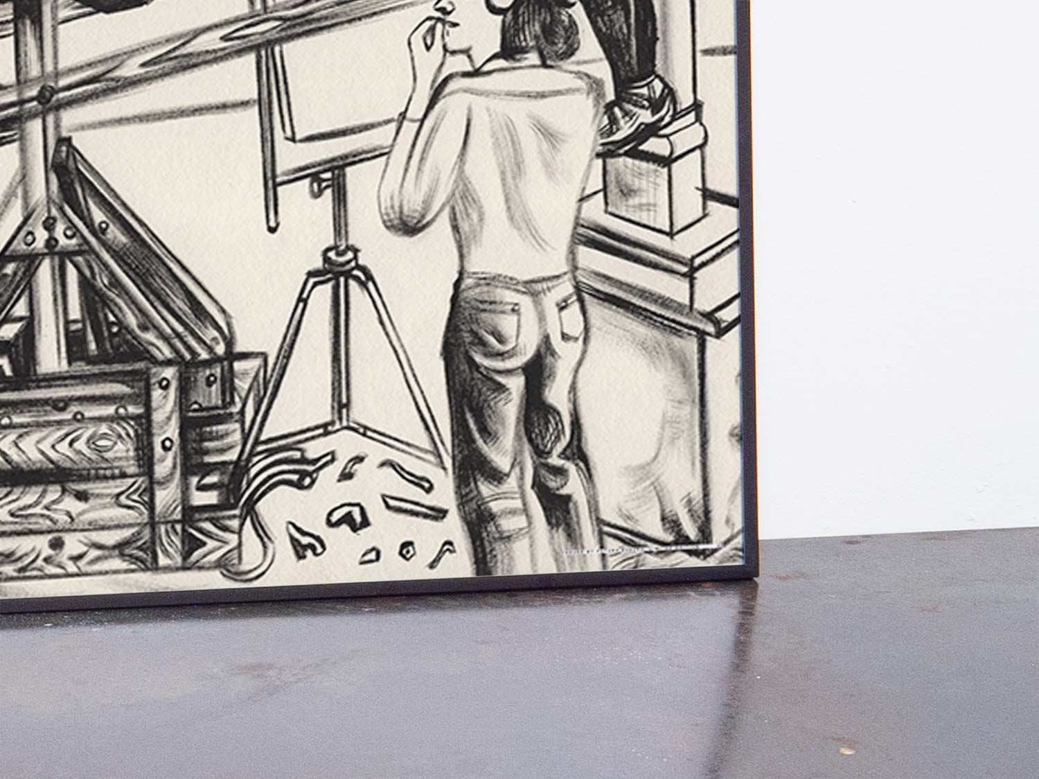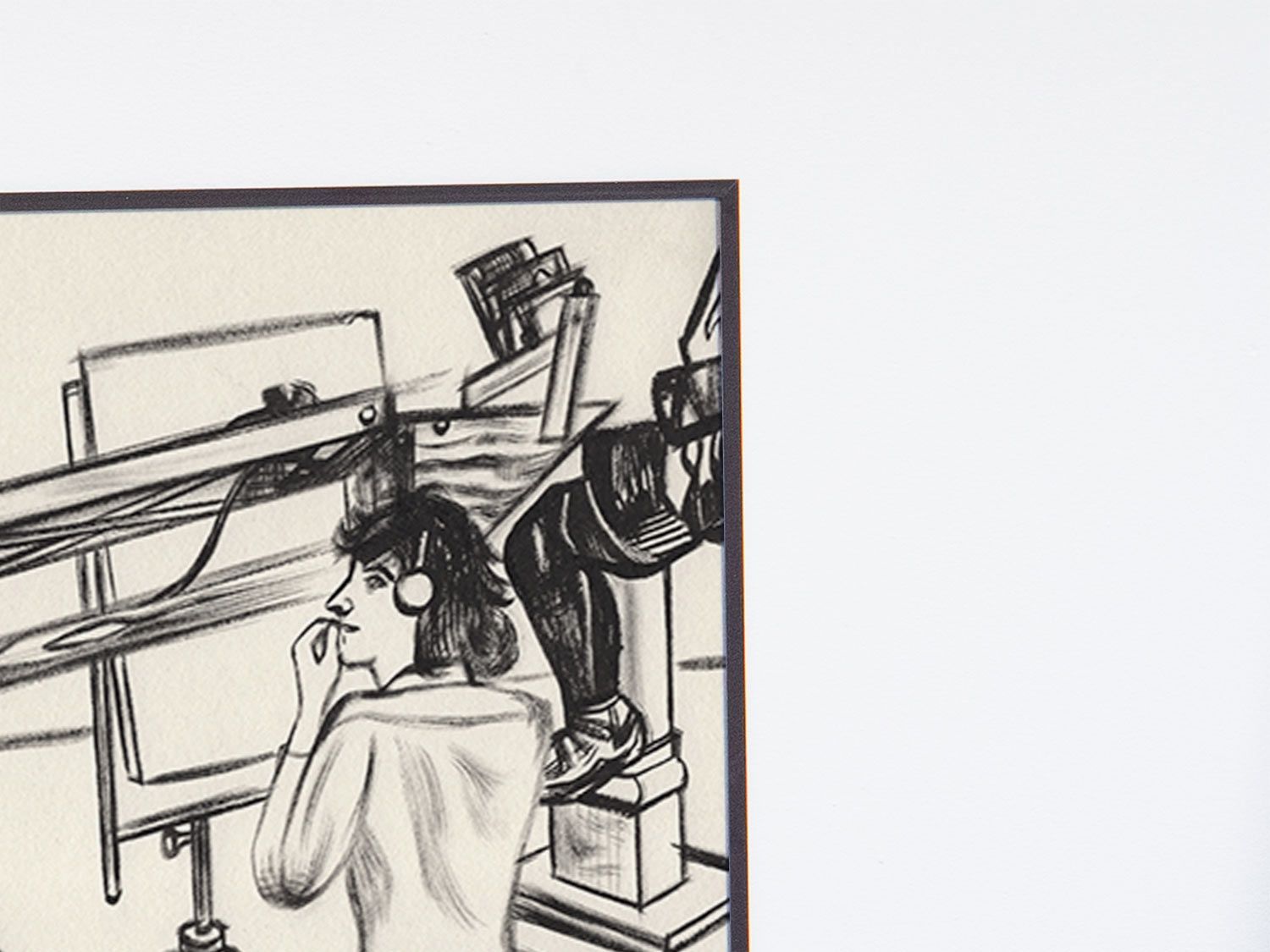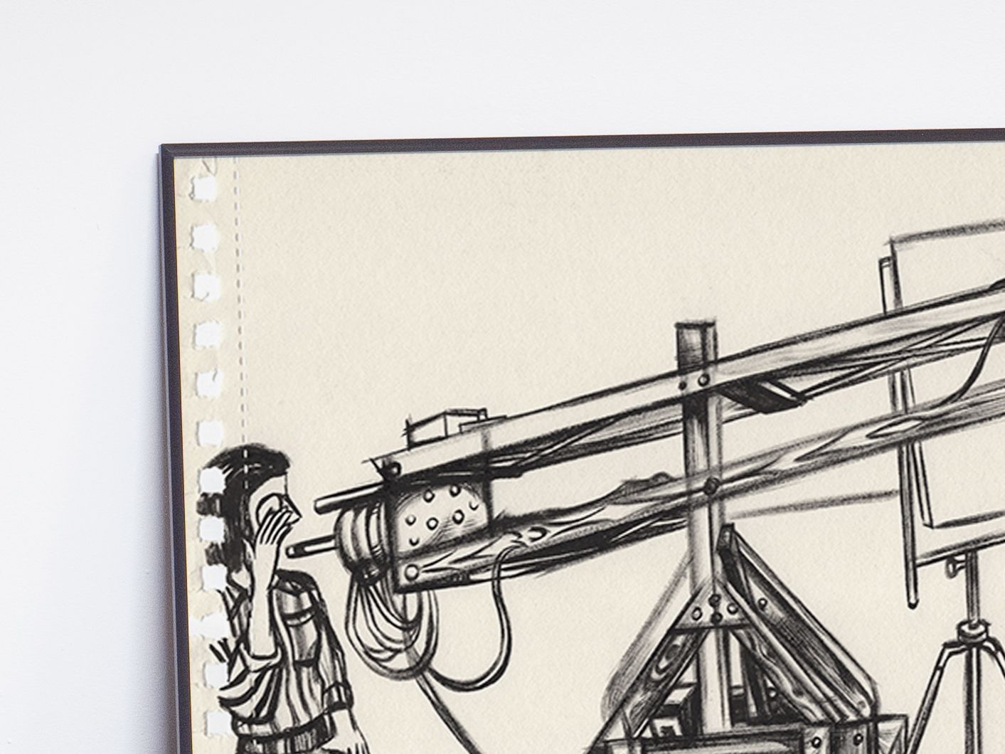 Cinema is a central theme in Marta’s work. This piece belongs to the Behind the Scenes series, where what is usually hidden becomes the main focus. Once again, her composition and unmistakable line shape this fine art print.